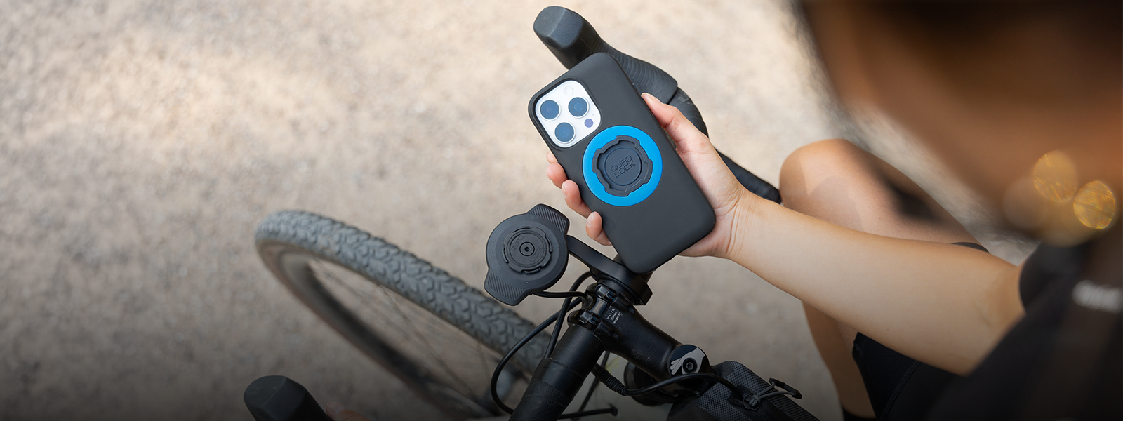 Quad Lock’s mounting system is used by cyclists around the world. Its unique dual-stage locking mechanism makes it possible to attach a phone quickly and securely, whether riding on the road, off-road, or using a bike for everyday transport.